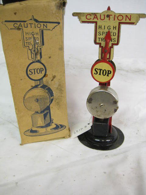 Sold9 Antique Train Accessories in OBsDESCRIPTION: Includes Lionel trainmaster transformer; Marx flood light tower; Marx railroad signs; Marx bell ringing crossing signal; Marx automatic blocking signal; Marx automatic switchman's tower;See Sold Price