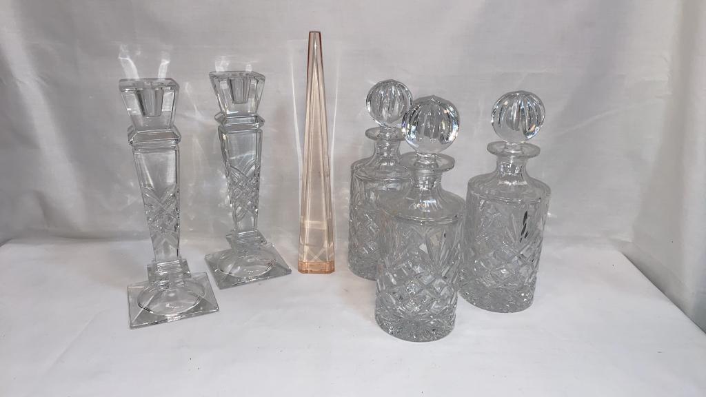 CRYSTAL DECANTERS, CANDLESTICKS, ETC