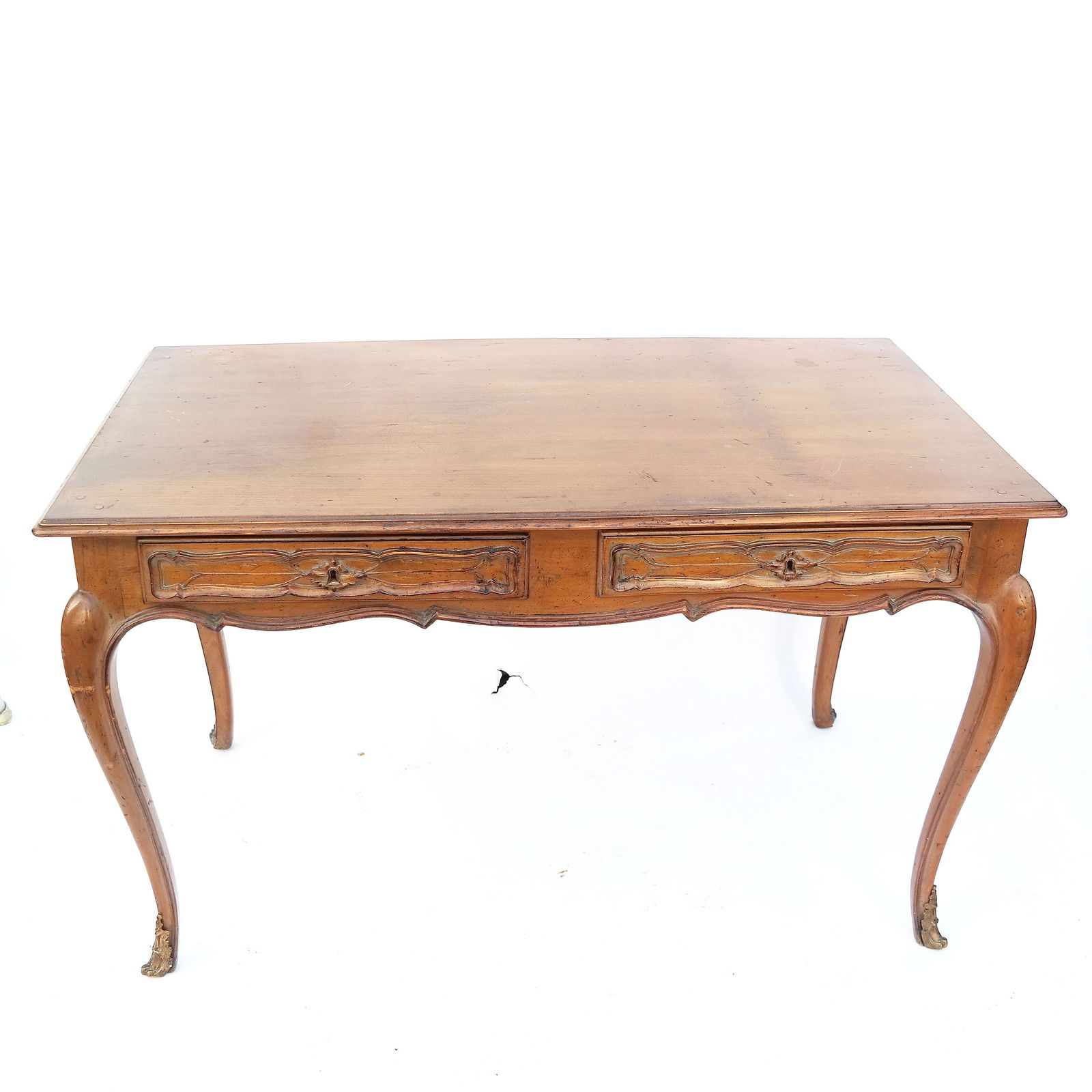 SoldVINTAGE LOUIS XV STYLE CARVED WALNUT WRITING DESKVintage mid 20th century carved walnut writing desk, Louis XV style. Measures 31.5" tall x 49.5" wide and 21.5" deep. Condition: minor scattered scuffs and signs of age/use, see images. Weight: est. aSee Sold Price