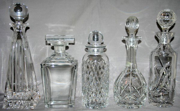 CUT CRYSTAL DECANTERS, FIVE, H 10" - 13"