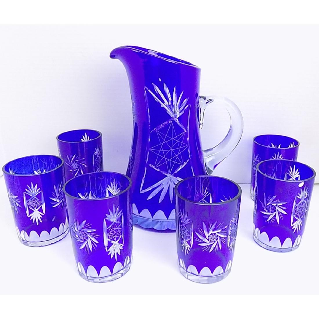 Sold(13) BOHEMIAN COBALT CUT TO CLEAR DRINKS SET(lot of 13) Bohemian cobalt blue cut to clear drinks set, in repeating geometric patterns, unmarked, including: (1) handled pitcher, approx 8.5"h, 6.5"w, 5 1/8"diam, (5) goblets, (one) with chip to riSee Sold Price