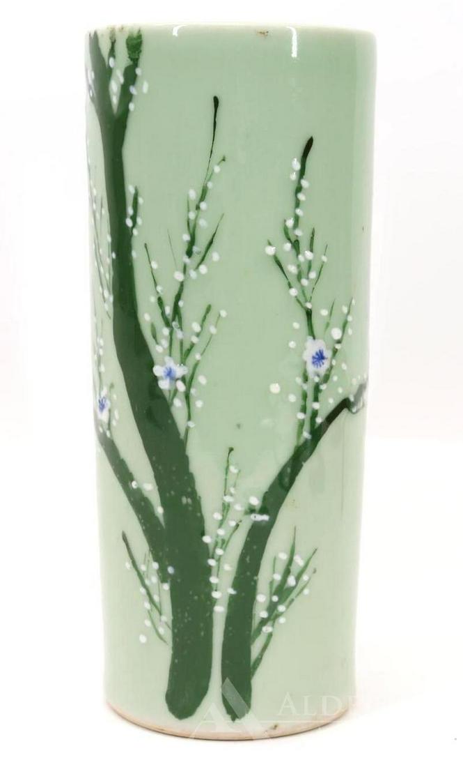 SoldCylindrical Celadon VaseJapanese enameled cylindrical celadon vase with lilac tree, unmarked. 11.5"h x 4.75"wSee Sold Price