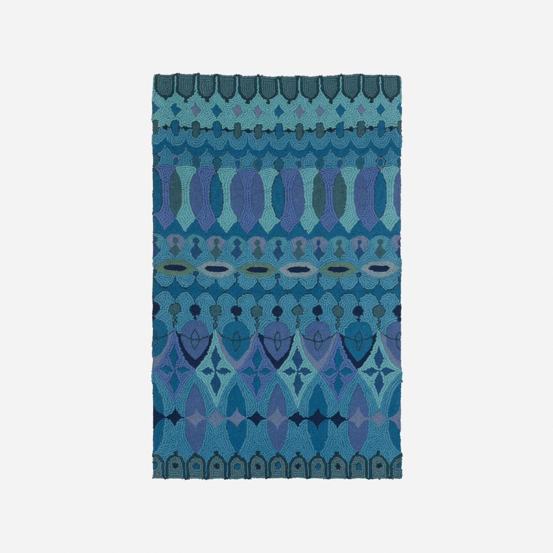 SoldCinthya Sargent carpetCinthya Sargent carpet USA, c. 1960 hand-hooked wool 59 w x 92 h inches Signed with partial applied fabric manufacturer's label to underside: [Design by Cinthya Sargent 100% Virgin Wool Hand Hooked].See Sold Price