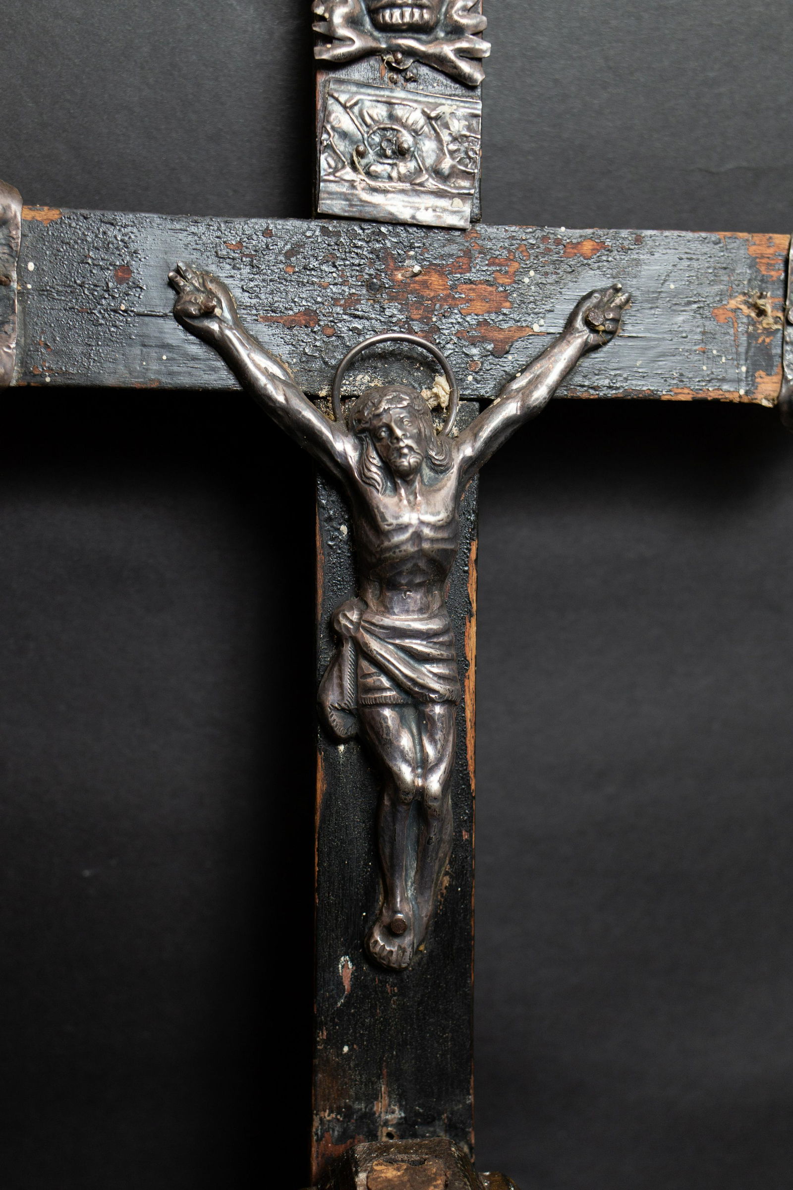 SoldA silver Crucified Christ with wooden support. KindomA silver Crucified Christ with wooden support. Kindom of Naples, 1766 (h. cm 45 ca.) IT Crocifisso da appoggio in argento con supporto in legno; base trapezioidale e canti modellati a cornice sagomataSee Sold Price