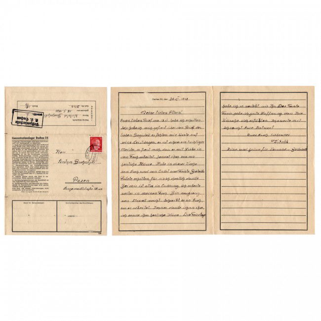 SoldFlossenburg Concentration Camp Letter & photoFlossenburg Concentration Camp Letter & photo, RARE KZL Letter from concentration camp Flossenburg, 1942 inmate to Father, prisioner numbr. 2353 block 1, double sided letter on camp paper, envelope, pSee Sold Price