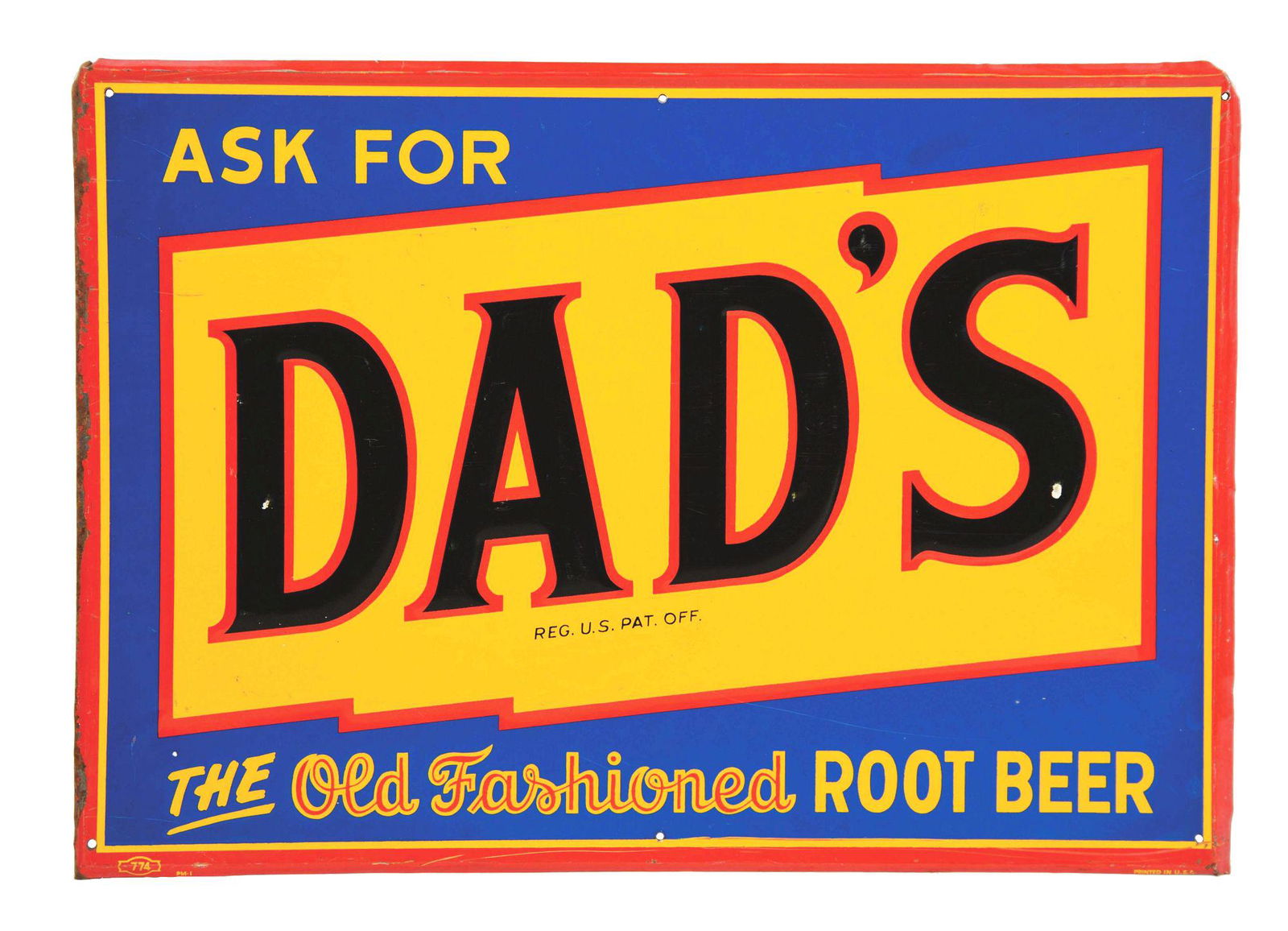 SoldDAD'S ROOT BEER SINGLE-SIDED EMBOSSED TIN SIGN W/ BOTTLECAP GRAPHICSST. Maker marked "PM-7." A c. 1950s "Dad's The Old Fashioned Root Beer" self-framed embossed tin sign. CONDITION: The sign has good color and shine throughout with minor areas of paint loss on both tSee Sold Price