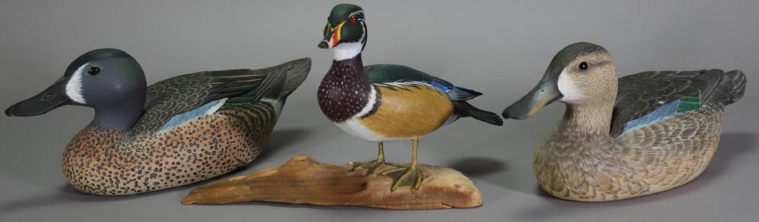 SoldVINTAGE DECOY GROUPING(3) Ducks and (1) goose. Carved and painted wood. Dimensions: (largest) H 10" x L18" x D 7". Condition: Wear consistent with age and use.See Sold Price