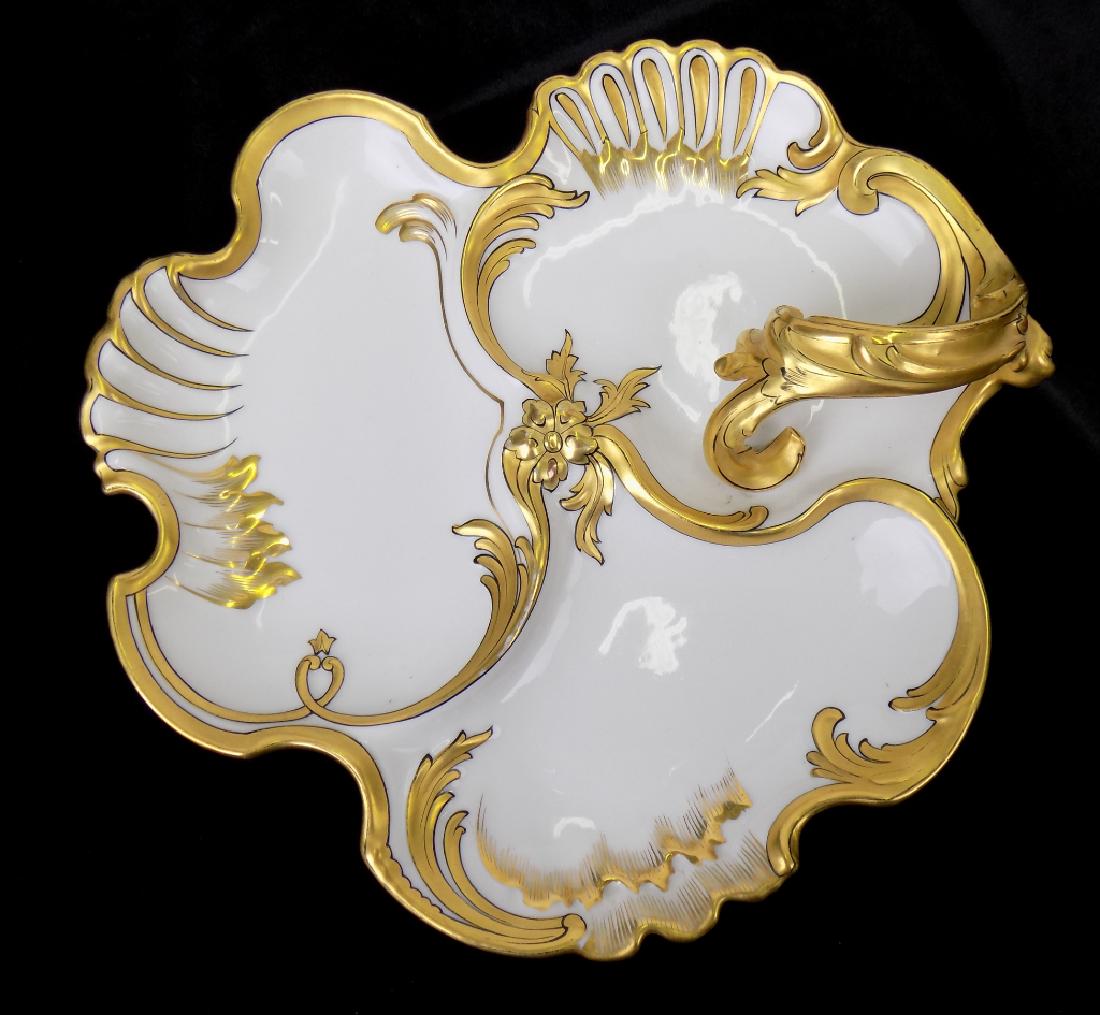 SoldLimoges Porcelain Serving Dish, Gold-Trimmed with HandleThis elegant Limoges porcelain serving dish measures 4.25"H and features a scalloped edge adorned with intricate gold trim. The dish is divided into three sections and is embellished with a hand-paintSee Sold Price