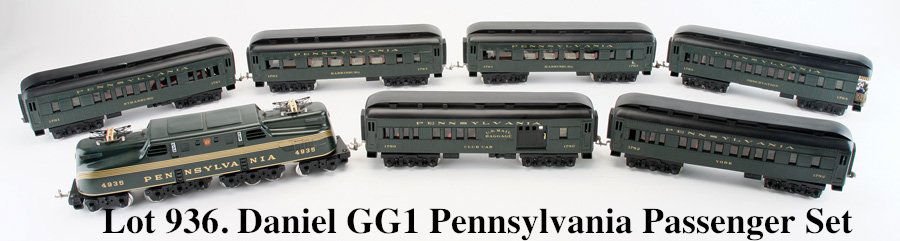 SoldLOT OF 8: VARIOUS MORE CONTEMPORARY LIONEL PENNSYLVANIA ENGINES & PASSENGER CARSAll in original boxes. (A) Lionel GG1 Green 5-Stripe #4935. (B) Pennsylvania "Little Joe" Electric Engine #8551. (C) Tuscan Red Pennsylvania F-3B Non-Powered Dummy Unit. (D) Set of Pennsylvania DoubleSee Sold Price