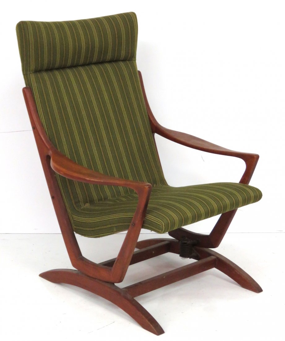 HANS OLSEN Danish Teak Modern Rocking Chair. Teak Rocker Frame has Woven Back. Fabric seat cushion AHANS OLSEN Danish Teak Modern Rocking Chair. Teak Rocker Frame has Woven Back. Fabric seat cushion AND Head Rest Cushion (Sometimes missing). Not Marked. Dimensions: Height: 39 inches, Width: 23 inche