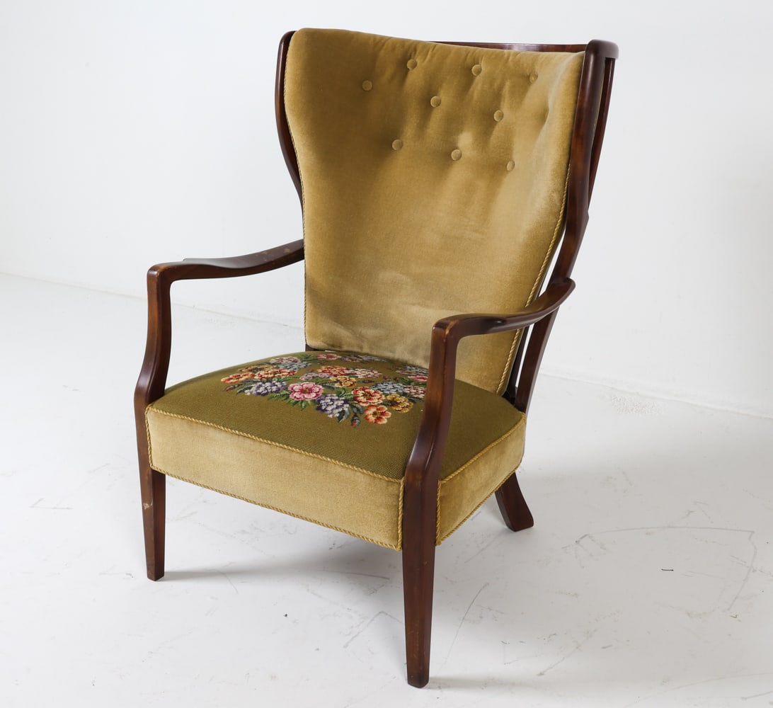 SoldMID-CENTURY DANISH WINGBACK LOUNGE CHAIR C. 1940SChannel back. Floral pattern-wool upholstery with welt cord accents. Dimensions: H 39.5" x W 29" x D 27", SH 15" Condition: Missing back button for neck pillow. Slight sun fading to back rest and seatSee Sold Price