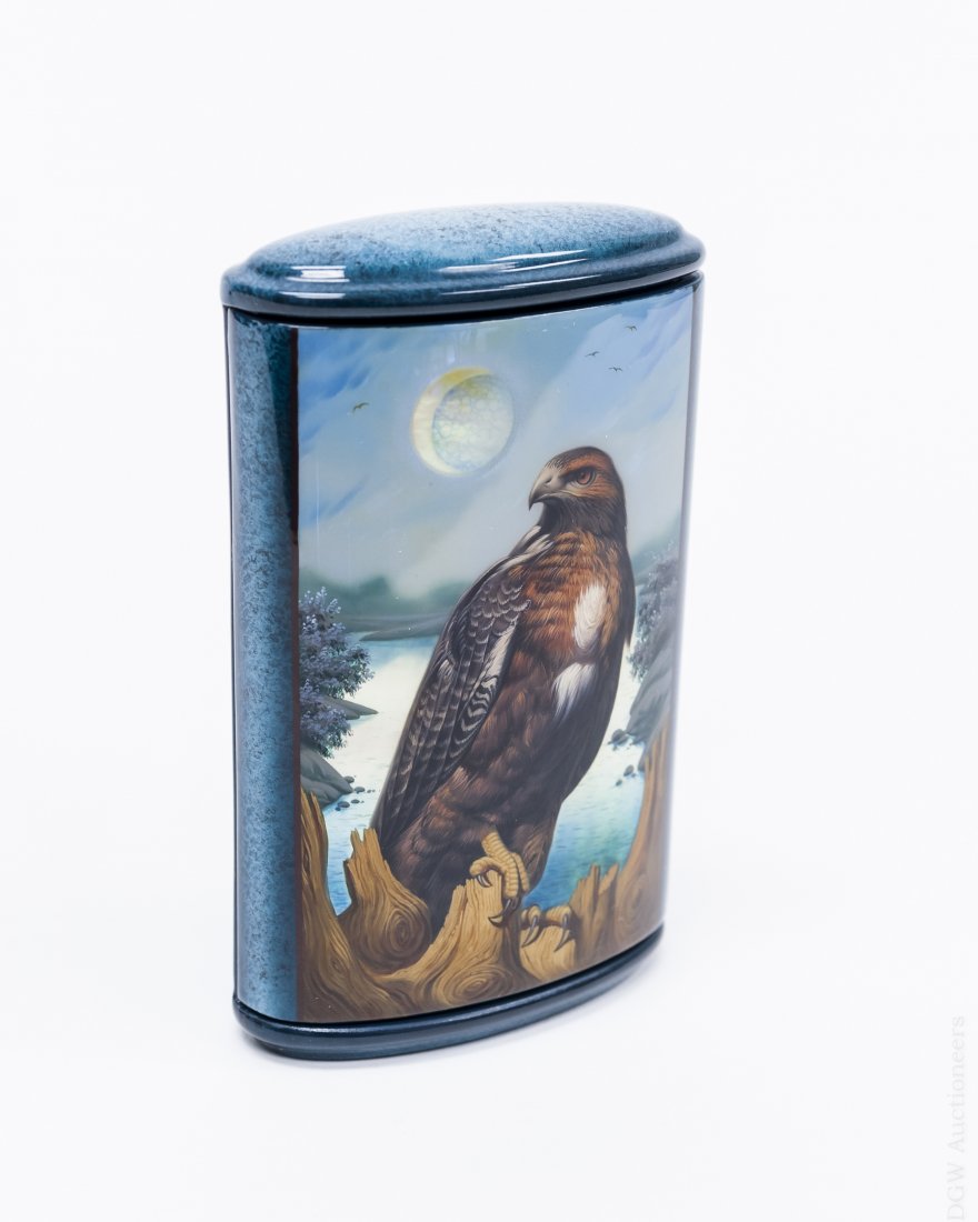 SoldDanshin Fedoskino Russian Lacquer Box.Danshin Konstantine Valerievich Fedoskino Russian lacquer box, "Hawk", 1999. Signed and dated with a gilt appliqué of a crown with ribbons on the interior. (Approx. 4 ¾" x 3" x 1 ½"). From the CollSee Sold Price