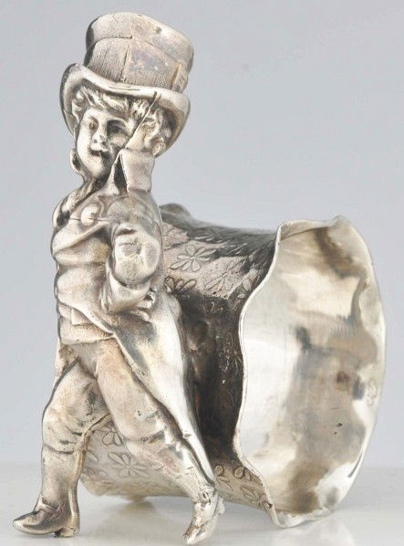 SoldFigural Napkin Ring, Boy With Drum On BackFigural Napkin Ring, Boy With Drum On Back, 3" x 3.75", Meriden #248 Silverplate, Private Illinois Collection.See Sold Price