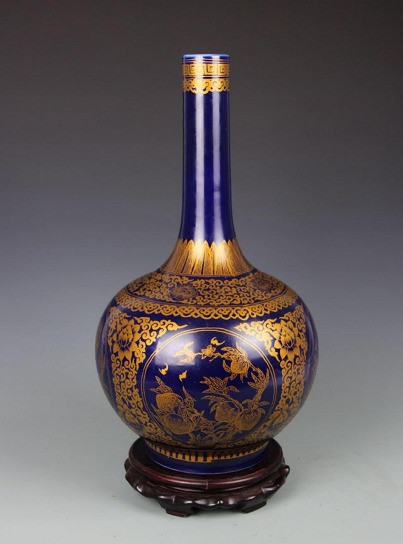 SoldTall Chinese Blue Glazed Porcelain VaseThe globular body rising from a short foot to a columnar neck with a bulbous mouth, the exterior covered with rich bubbled dark blue glaze, the bottom with a six-character mark. Approx. 14.9*8 inch.See Sold Price