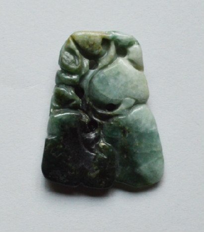 Dark Green Jadeite PendantLarge dark green to almost white jadeite pendant, intricate carving, wedge shaped, heavy.2 inches by 1.5 inches.See Sold Price