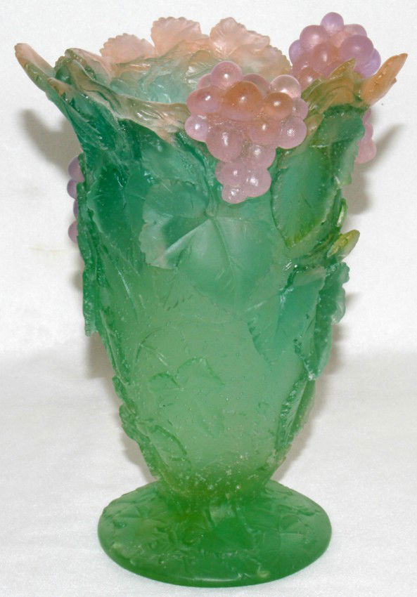 Signed Daum France Pate de Verre Grapevine Vase 9"