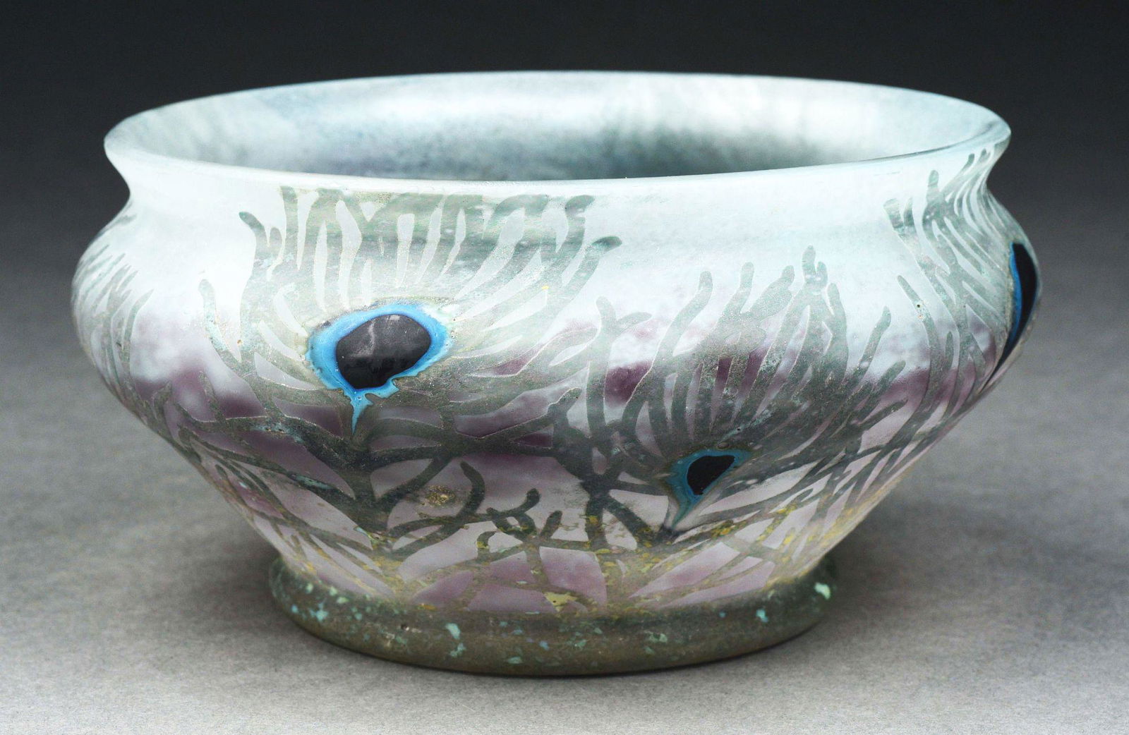 DAUM NANCY MARQUETRY PEACOCK VASE.