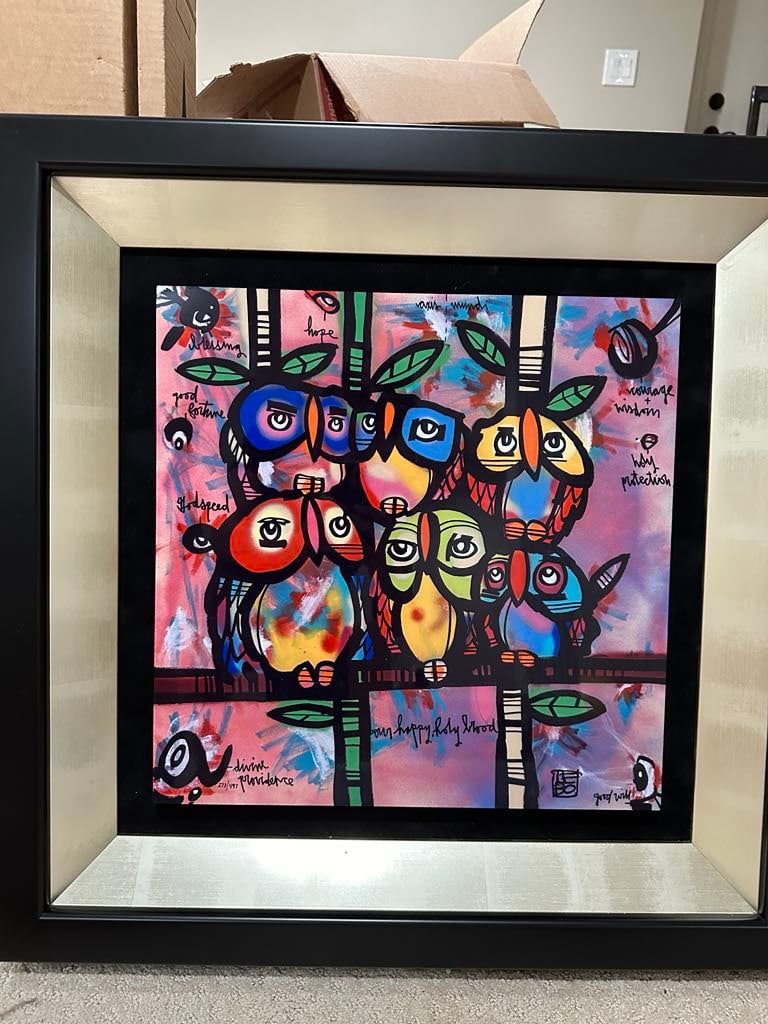 Lebo David Le Batard B1972 Cuban American PaintingLebo David Le Batard B1972 (Cuban American Floridian) Acrylic Painting, Titled "OWL HAPPY HOLY BROOD". Frame measure 27" X 33 3/4", sight 22" X 29". Please carefully read our terms of sale, shipping iSee Sold Price