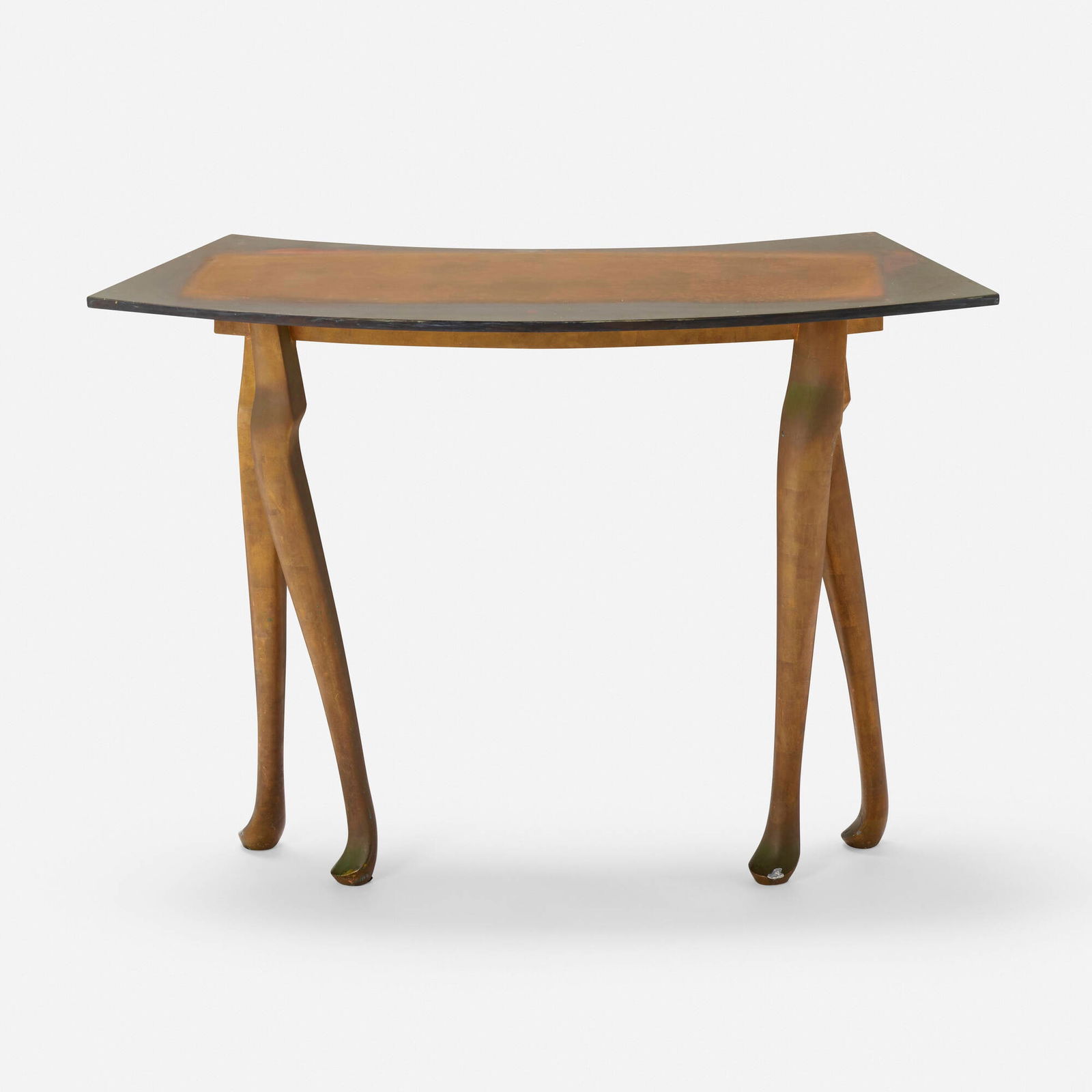 SoldDavid Perry, Queen Anne consoleDavid Perry Queen Anne console 1988copper, gold leaf on wood 99.5 h x 15 w x 27.75 d in (253 x 38 x 70 cm) Signed and dated to underside 'David Perry 1988'. This work is unique. Sold with a diSee Sold Price