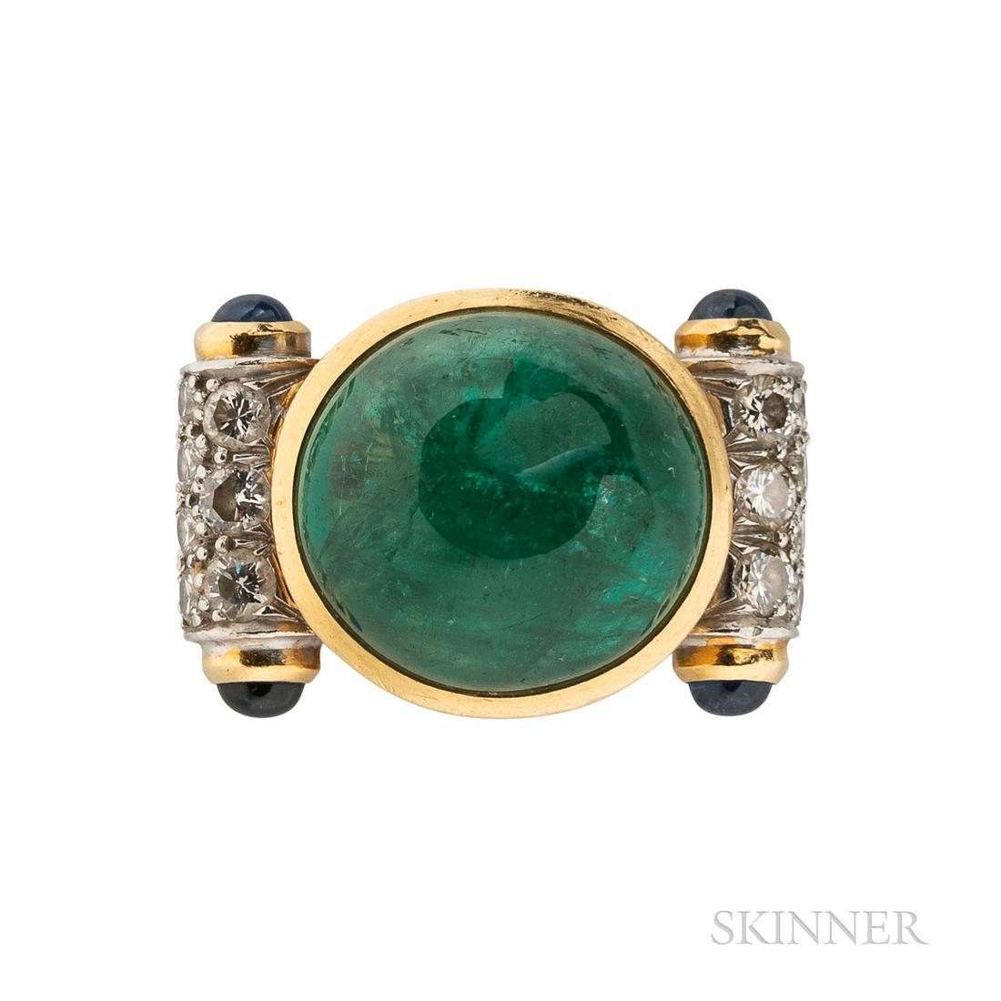 David Webb Emerald and Diamond Ring, bezel-set with an