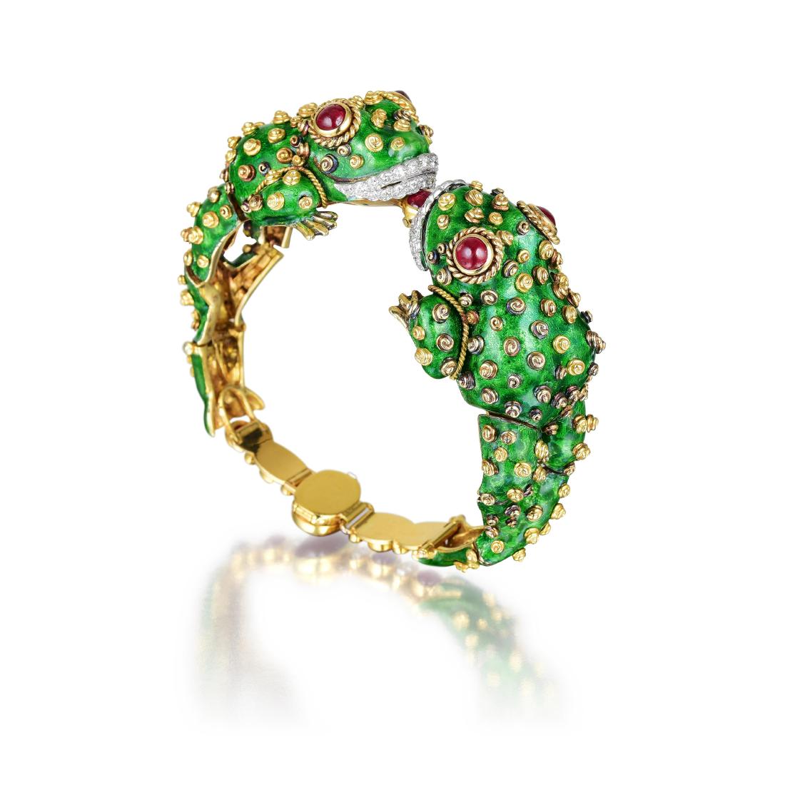 SoldDavid Webb Diamond Ruby Enamel Gold Platinum FrogVintage David Webb frog hinged bracelet made in 18k yellow gold and platinum, vibrant green enamel body, accented with 2 oval cabochon cut rubies for eyes and and one round cabochon cut ruby set in thSee Sold Price