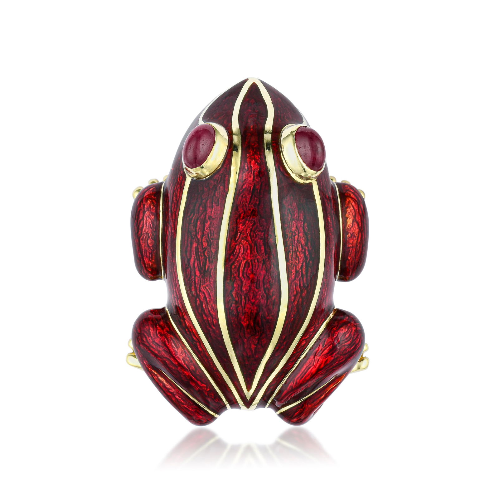 SoldDavid Webb Gold, Green Enamel and Cabochon Ruby Frog Ring18 kt., patterned green enamel, 2 round cabochon ruby eyes, signed Webb, ap. 11.4 dwts. Size 4, with inner guard. Cabochon rubies: bright medium pinkish red, moderately included, tSee Sold Price