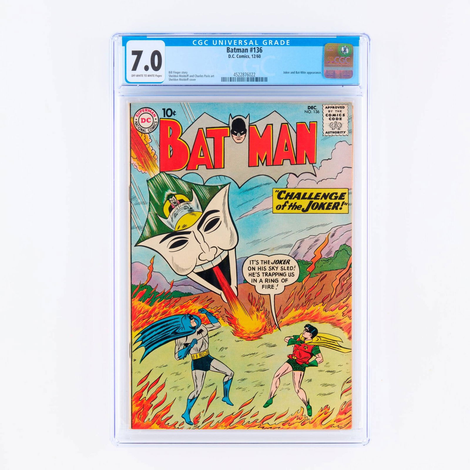 SoldD.C. Comics Batman Comics #136 CGC 7.5D.C. Comics Batman Comics #136 CGC 7.5 USA, 1960 This issue features a Joker and Bate-Mite appearance and iconic cover of the Joker's Sky Sled by Sheldon Moldoff in the vehicle's first and only appearSee Sold Price
