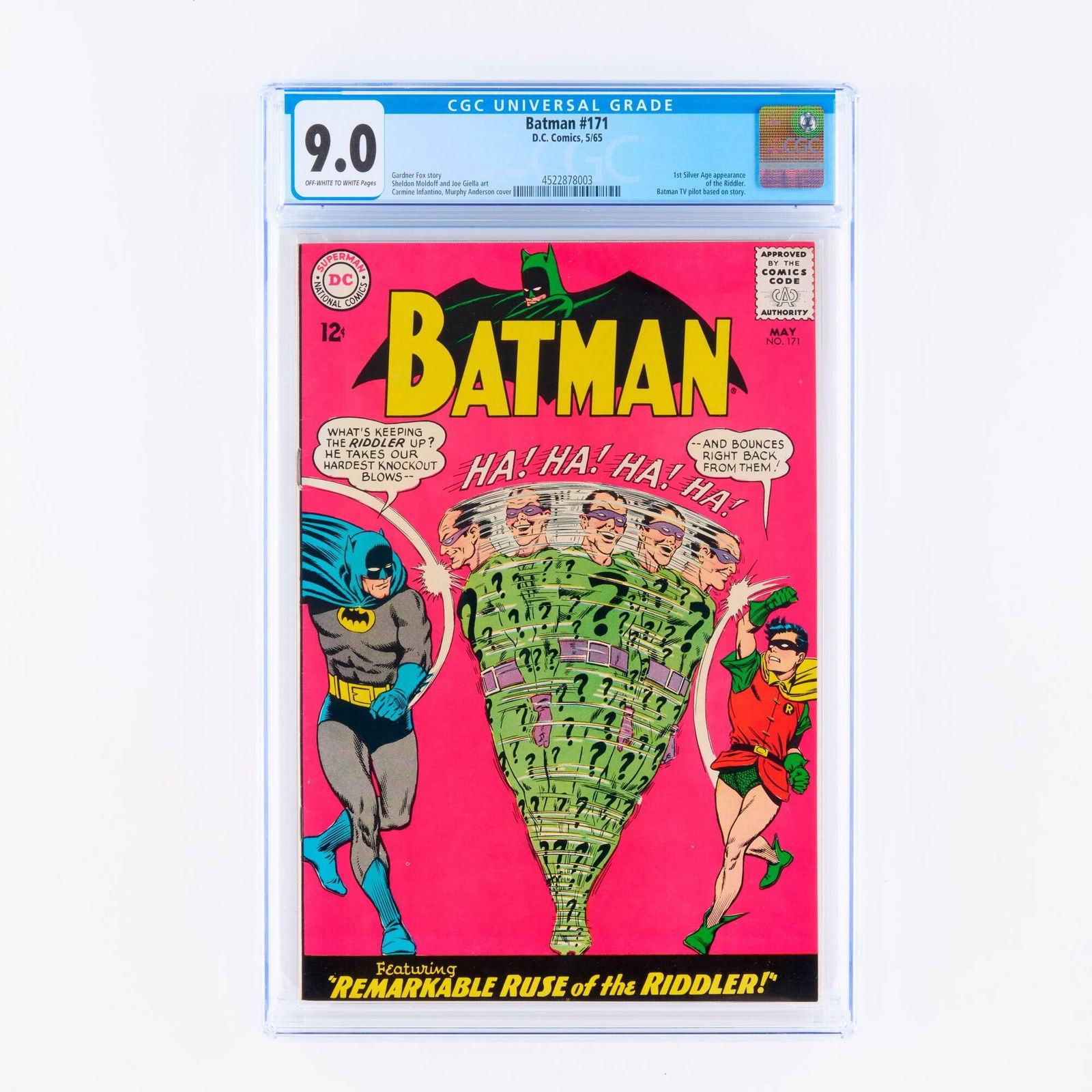 SoldDC Comics Batman #171 CBCS 4.0United States 1965 D.C. Comics Batman issue 171 from May, 1965. The book featured the first Silver Age appearance and origin of the Riddler. CBCS 4.0 w/ Cream/Off-White Pages CBCS case 13" x 8"See Sold Price