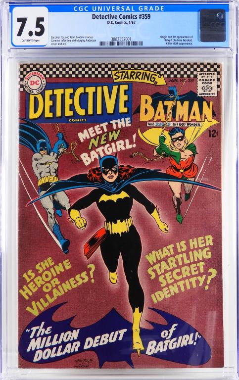 SoldD.C. Comics Detective Comics #359 CGC 7.5D.C. Comics Detective Comics #359 CGC 7.5 USA, 1967 This issue features the origin and first appearance of Batgirl (Barbara Gordon) and a Killer Moth appearance. Gardner Fox and John Broome stories wiSee Sold Price