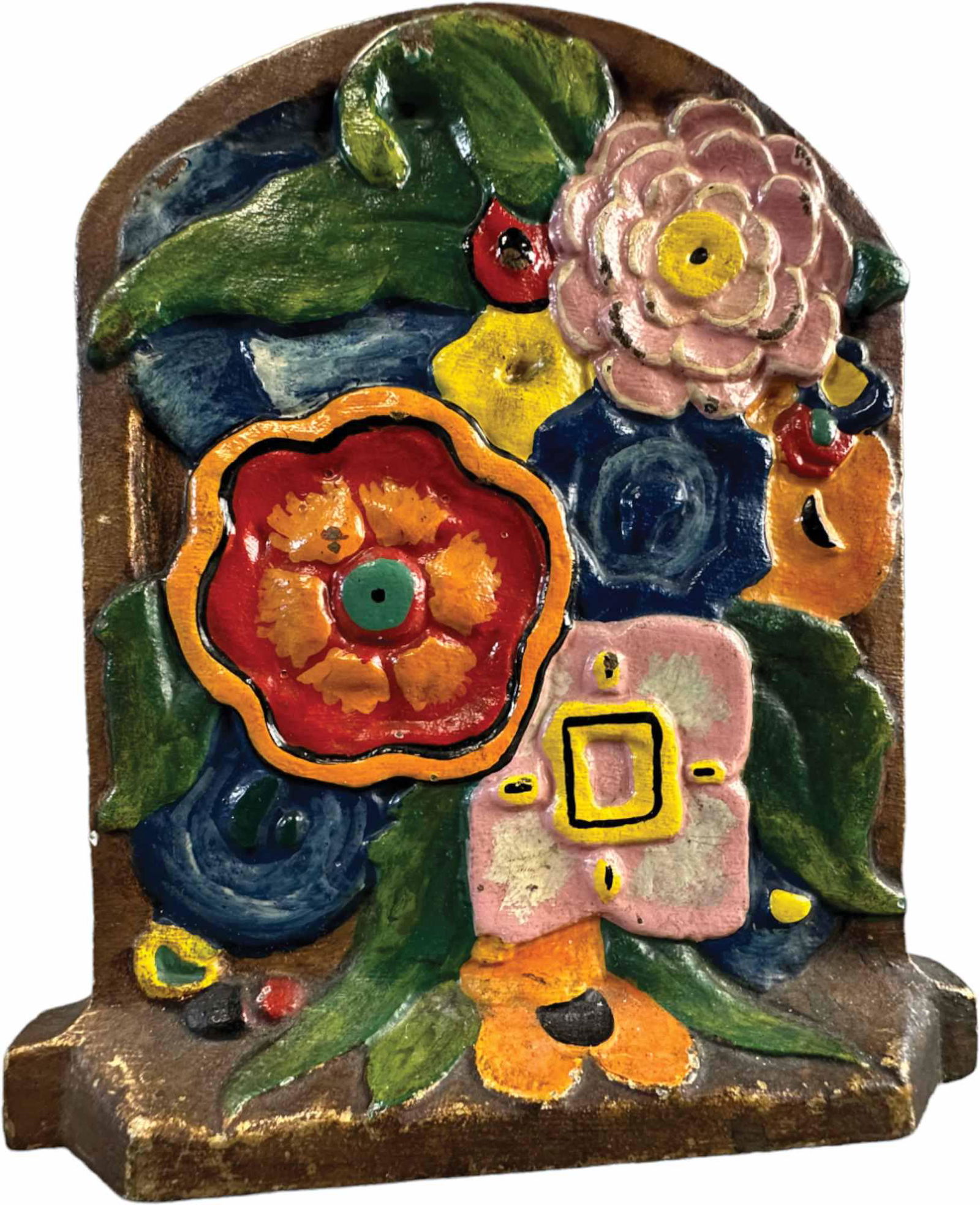 SoldCast Iron Flower Doorstop.Depicts grouping of deco flowers in pastel colors on black background.See Sold Price