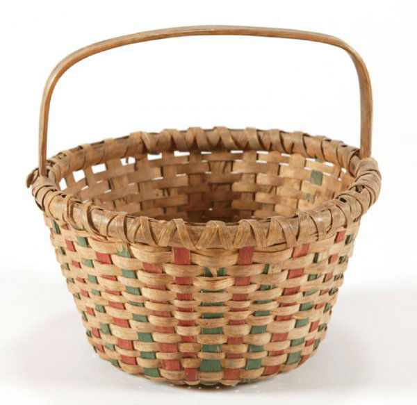 SoldCherokee Indian Stained Decorated BasketHeight to rim is 4.5", height to handle is 8", basket size is 9.5" x 9" ca. 1920 stained oak split basket. Fantastic form and great color. A prime example of color decorated early 20th century basketSee Sold Price