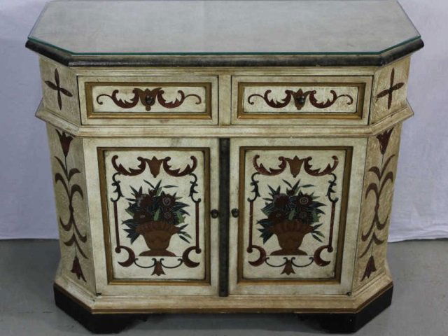 Decorated Two Door Commode with Glass Top