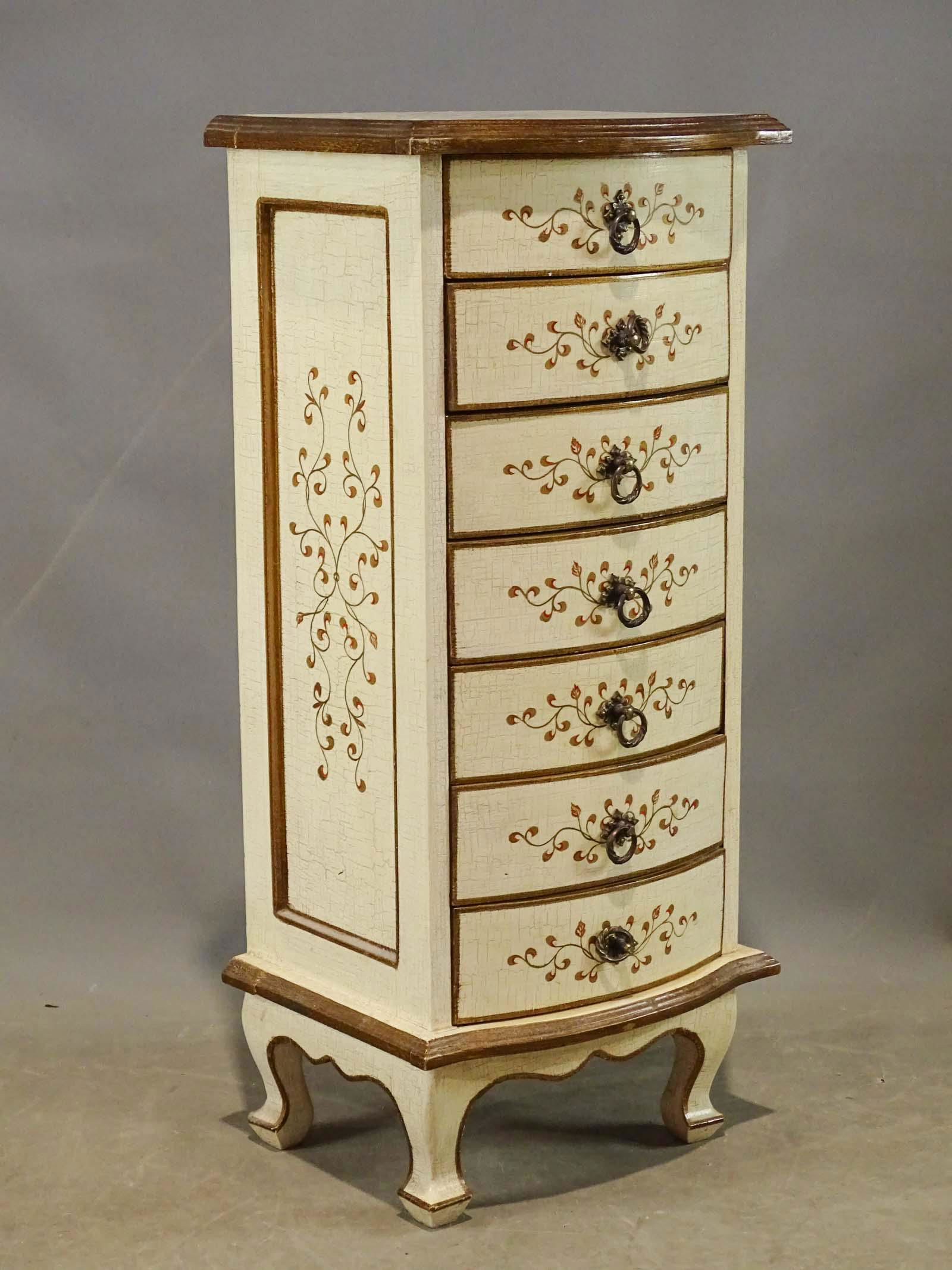 SoldVENETIAN STYLE HAND PAINTED THREE DRAWER COMMODEItalianate decorative chest with a cream-colored lacquered finish, hand-painted floral bouquets, and gilded molding accents on cabriole legs Approximate Dimensions: 31”H x 31”W x 14&rdquoSee Sold Price