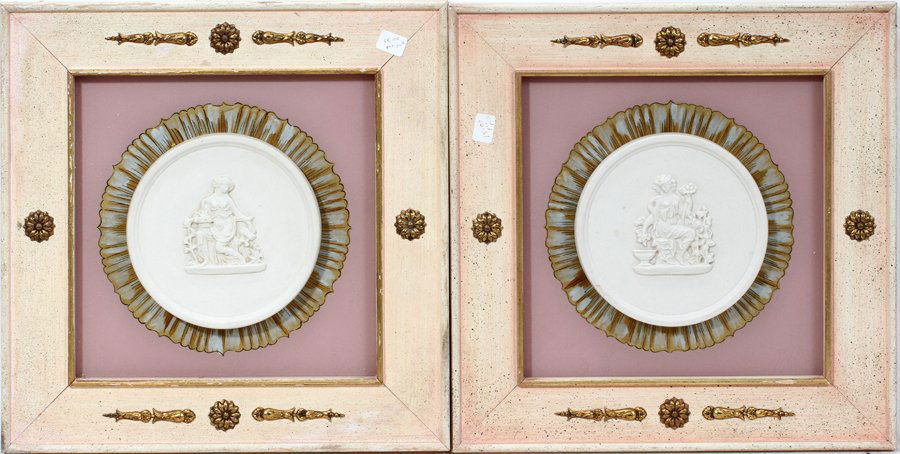DECORATIVE FRAMED BISQUE PLAQUES PAIR, DIA 7"