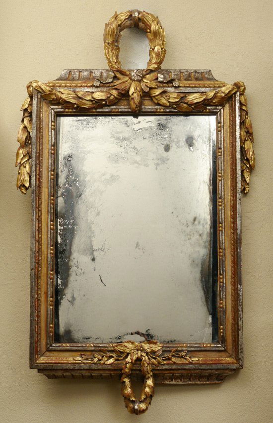 SoldAntique 19thC Federal Sheraton Gold Gilt MirrorAntique Gilded Rectangular Wood Framed Wall Mirror. Ornate frame has florets at each corner and plaster decorative elements throughout. Back is covered with wood. Would look stunning in an entryway, oSee Sold Price