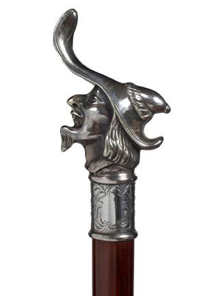 SoldTwo Antique Silverplate Hound Head Handled CanesTwo Antique Silverplate Hound Head Handled Caneslate 19th century, including a leather hook handle with silverplate bulldog head mount, over a black laquered wood shaft, unmarked (35 1/2 in.); the secSee Sold Price
