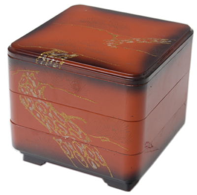 SoldJapanese Lacquer Box with CoverLovely lacquer ware box with flying cranes decoration and signature cartouche on lid.Size: 4 x 12 x 9 in.See Sold Price