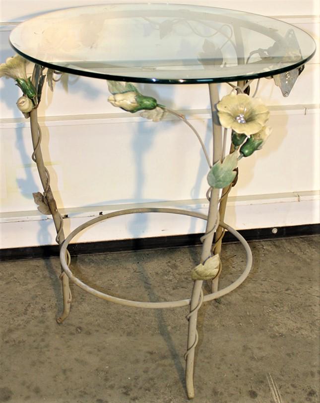Decorator Palm leaf form Base Glass Top Center Table. Occasional Table. High Gloss Gray Finish. CoulDecorator Palm leaf form Base Glass Top Center Table. Occasional Table. High Gloss Gray Finish. Could use as dinette dining table. Dimensions: H: 30 inches: W: 48 inches: D: 48 inches --- We offer cur