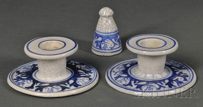 Dedham Pottery Rabbit Candleholders and Snuffer Gla