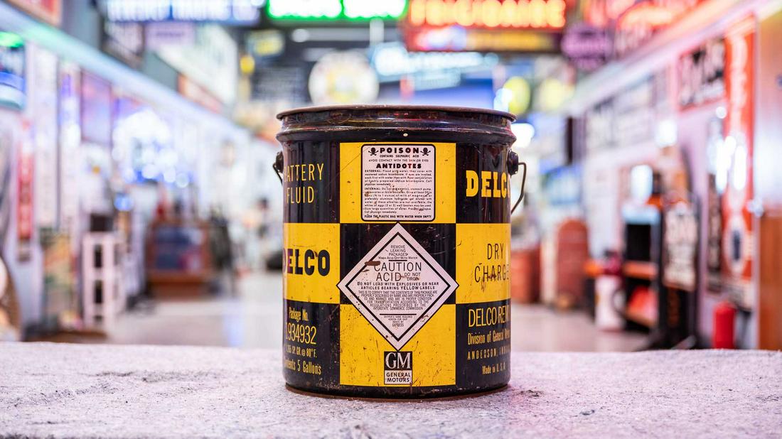 Delco Battery Fluid Bucket with Assorted Battery Caps