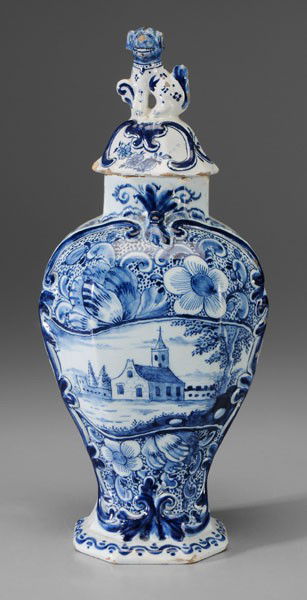 SoldDelft Blue & White Porcelain Lidded Jarwith alternating floral reserves. 16" high, 8 3/4" diameter. Small scattered flicks.See Sold Price