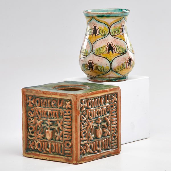 A lot of two Belgian Torhout decorated earthenware objects17 hrs LeftEarthenware Majolica Planter, Crate & Barrel VaseMar 08, 2026Four Rookwood Art Pottery Vases2 days LeftThree Mintons Ltd. "Secessionist" WaresMar 13, 2026Studio Pottery (5) Items [ARTIST SIGNED]2 days LeftJohn Glick (1938-2017) Plum Tree Pottery Mid Century Sculptural Handled VasesMar 15, 2026Roseville Art Pottery "Donatello" 575 JardiniereMar 17, 2026Muncie 1920s Vintage Art Deco Pottery Ceramic Vases6 days LeftRoseville Moss 1936 Vintage Art Pottery Vases6 days LeftRoseville Thornapple Dawn Rosecraft Blue Green Vintage Pottery Vases6 days LeftHand incised Rookwood vase, Earl Menzel, 19372 days LeftAn Exquisite Wucai Dragon Pattern Seawater Pattern VaseMar 06, 20263 pcs AUSTRIAN CERAMICS: AMPHORA & ROYAL DUX2 days LeftClarice Cliff (English, 1899-1972) Bizarre pattern, vase and lidded jar3 days LeftRoseville Arts and Crafts Monticello Vases (2)Mar 07, 2026CHINESE PORCELAIN EWER & VASE1 day Left