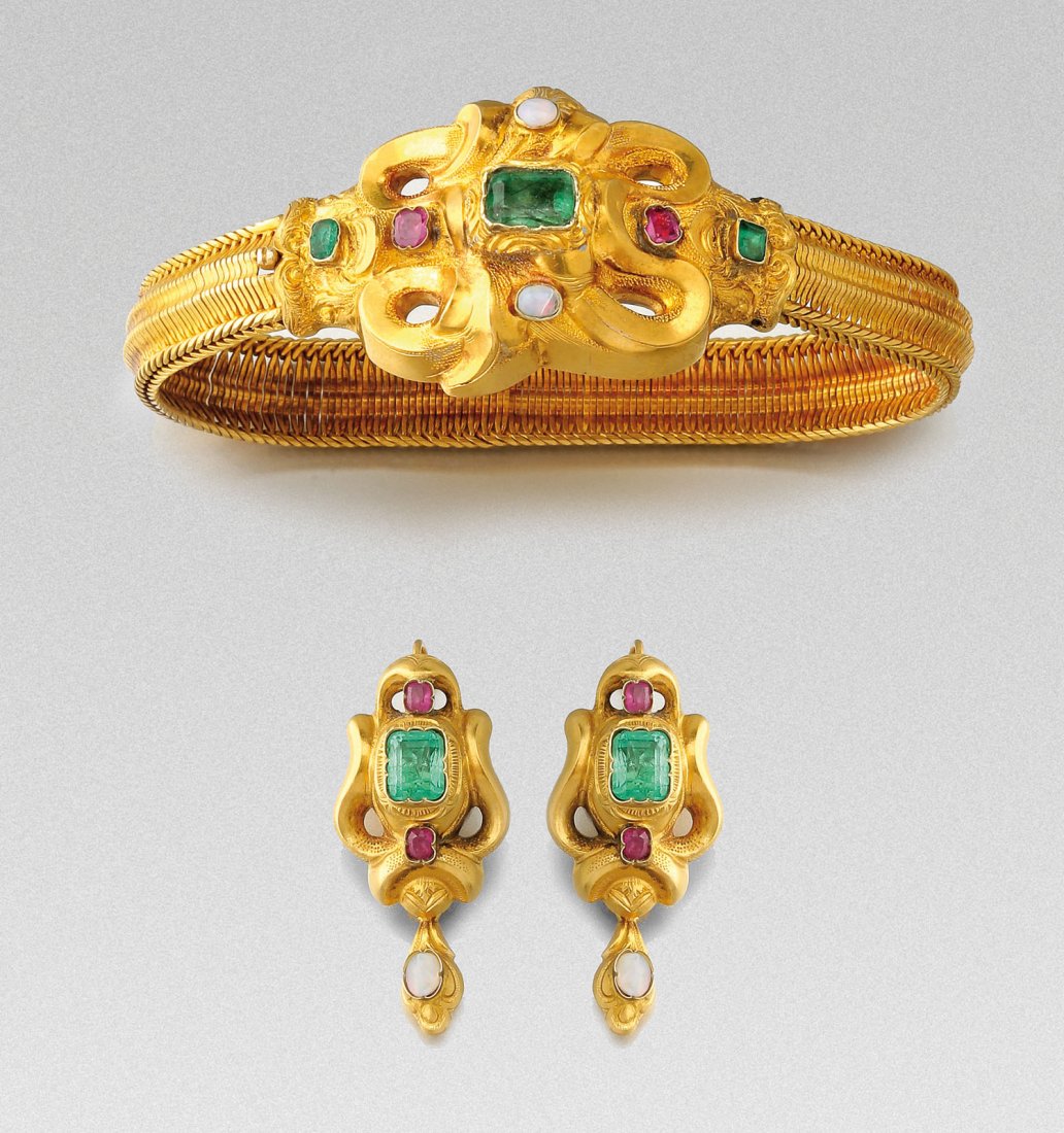 SoldDemi ParureConsisting of necklace, brooch, and earrings, 19th century, 18-karat gold, necklace length 42 cm.See Sold Price