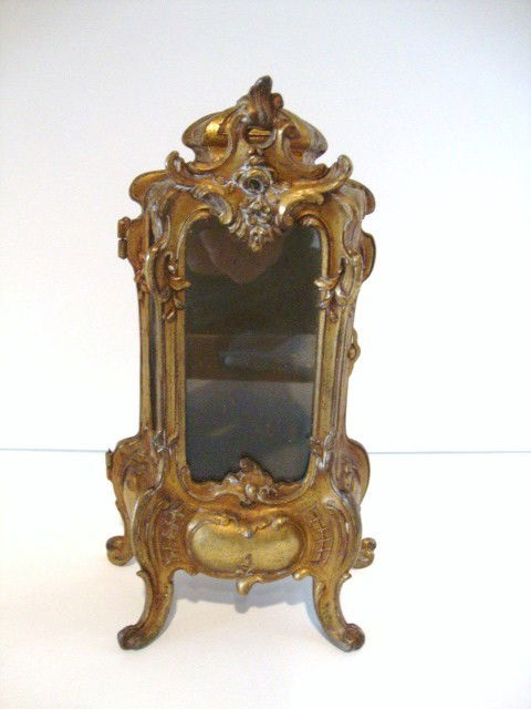 SoldFRENCH GILT METAL VITRINE CABINETBACK OPENS WITH TWO INTERIOR SHELVES. MRKD. ON BOTTOM "DEPOSE N25". 7 1/2" H. Terms: PLEASE READ CAREFULLY - Terms for Purchasing and Shipping of Auction Items. Please read carefully before bidding. ASee Sold Price