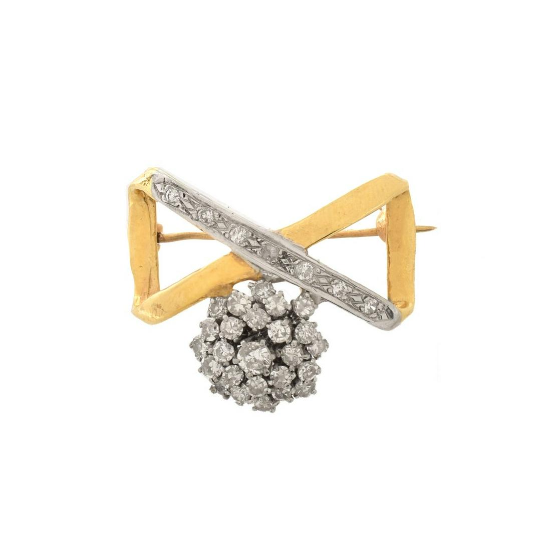 SoldDiamond and 14K BroochVintage Approx. 2.0 Carat TW Round Brilliant Cut Diamond and 14 Karat Yellow Gold Ribbon Brooch. Diamonds F-G color, VS1-VS2 clarity. Stamped 14K. Measures 3/4" H, 1" W. Approx. weight: 6.29 grams. CoSee Sold Price