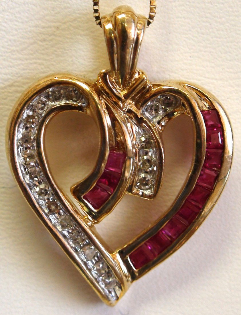 Soldmarked 10K Gold Diamond & Ruby Heart Shape Pendant Necklace on a 10K Gold 18 inch Chainmarked 10K Gold Diamond & Ruby Heart Shape Pendant 3/4 in. x 1/4 in. Necklace on a 10K Gold 18 inch Chain.See Sold Price