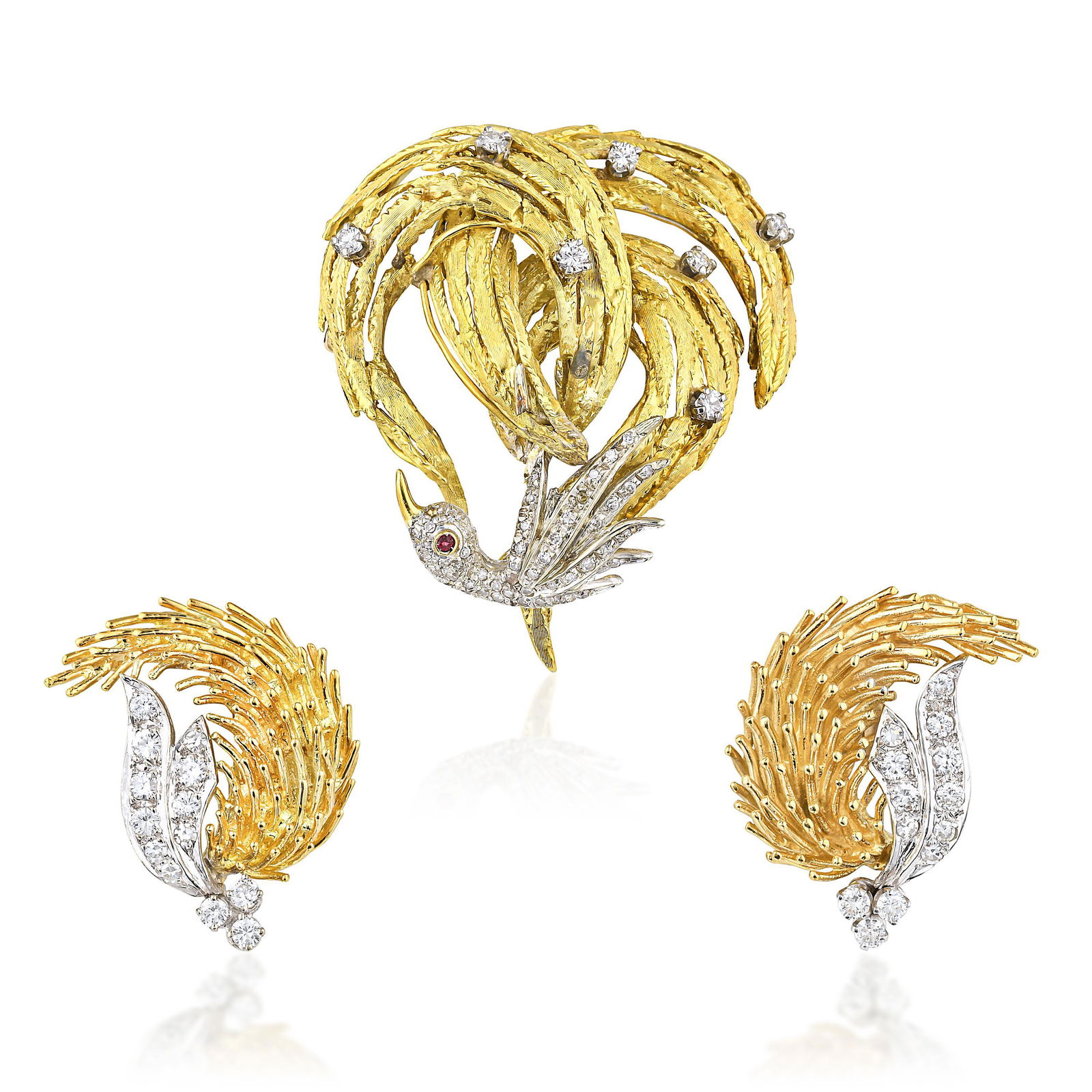 SoldA VINTAGE BURMA NO HEAT RUBY AND DIAMOND BIRD BROOCH in yellow and white gold, designed as aA VINTAGE BURMA NO HEAT RUBY AND DIAMOND BIRD BROOCH in yellow and white gold, designed as a cockatoo perched on a branch, the head pave set with round brilliant cut diamonds and a round cut ruby eye,See Sold Price