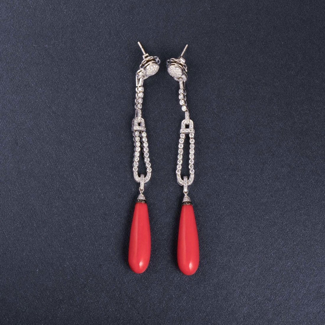 Platinum 18K White Gold Diamond Coral Drop Earrings 7 Cts
