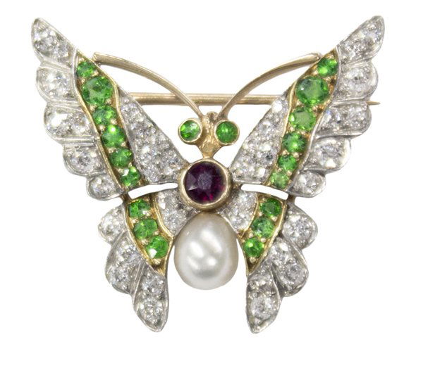 Diamond demantoid garnet ruby pearl butterfly pin