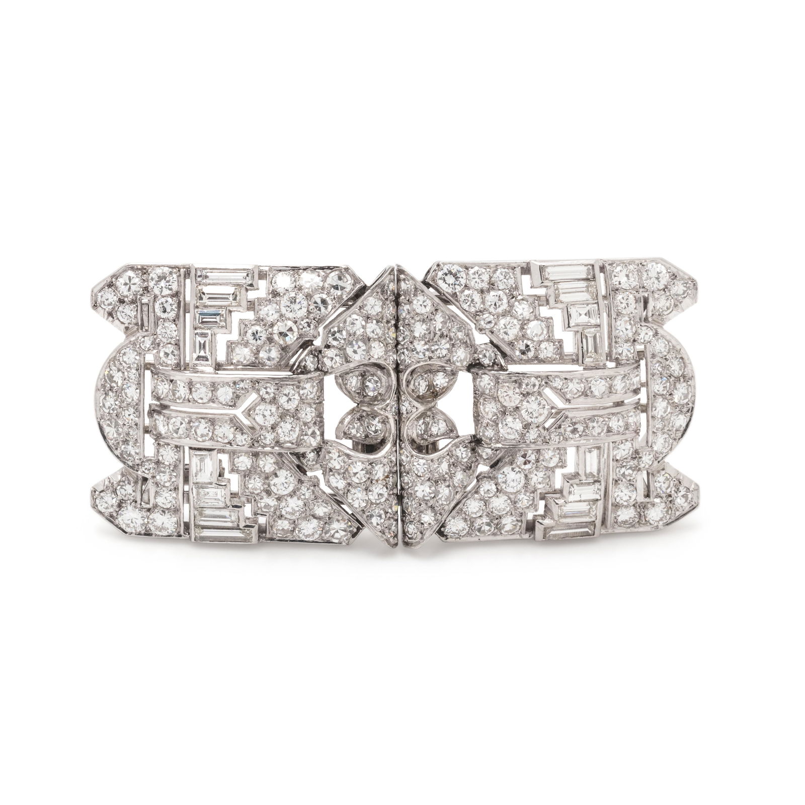 SoldPlatinum diamond double clip, c. 1930, 20.5 dwtsPlatinum diamond double clip, c. 1930, 20.5 dwts Length: 2.5".This fine art deco diamond brooch contains approximately 198 .10ct(average) round and baguette diamonds and two .50ct round diamonds, allSee Sold Price